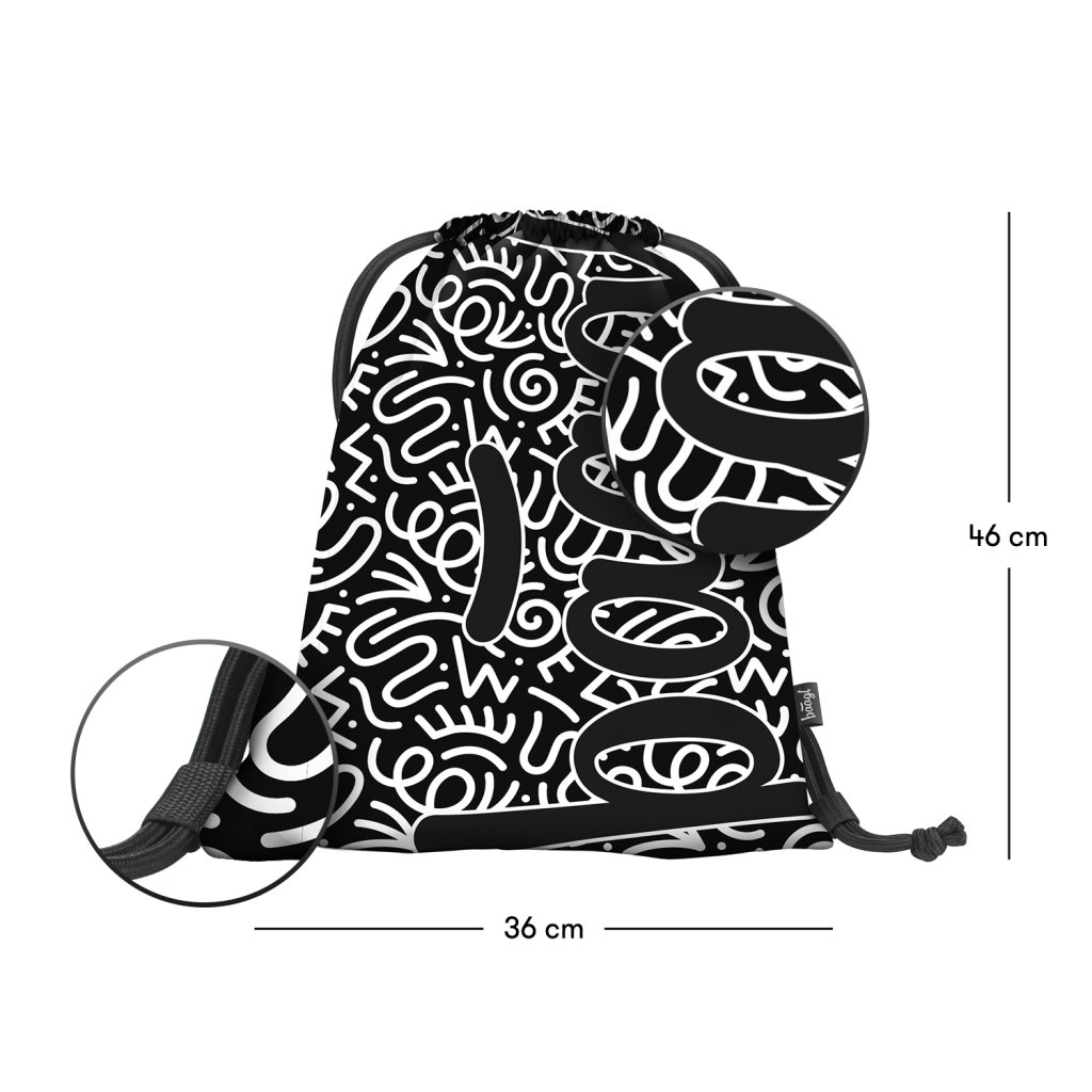 Škrabanie s pevnými šnúrkami odpoveď: Taška je vybavená pevnými sťahovacími šnúrkami, ktoré umožňujú ľahké vyzliekanie a slúžia aj ako popruhy na nosenie na chrbte. Táto konštrukcia zaručuje pohodlné a bezpečné nosenie, či už do školy, na školenie alebo na výlet.