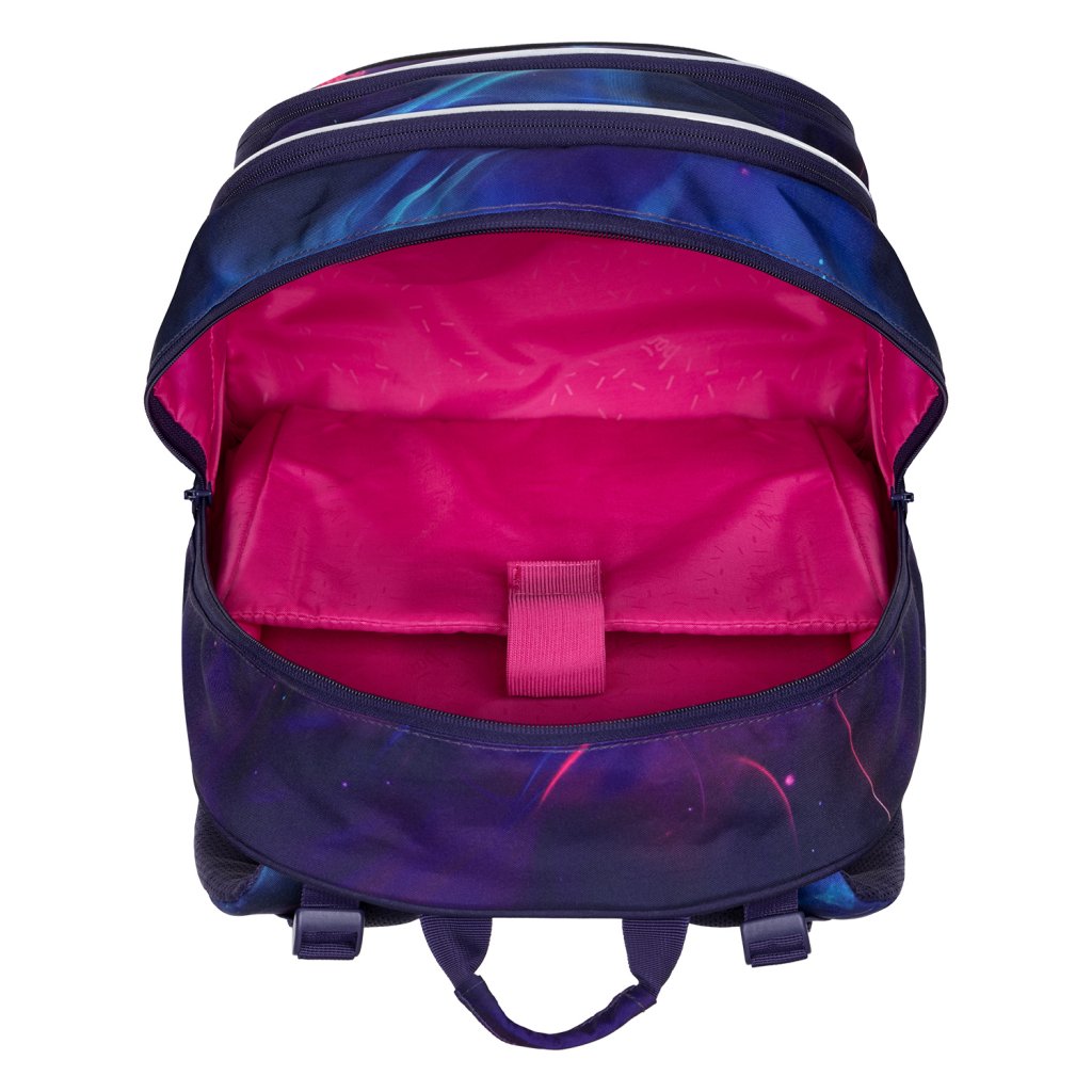 Jadro batohu má anatomicky tvarovaný chrbát s vetraním, ľahkú konštrukciu a tri oddelené priehradky s organizérom. Nechýba polstrované vrecko na notebook (15"), termokapsula na občerstvenie alebo reflexné prvky na zvýšenie viditeľnosti v tme. Vďaka posuvnému systému ramenných popruhov sa batoh prispôsobí výške dieťaťa a zabezpečí jeho pohodlné nosenie.