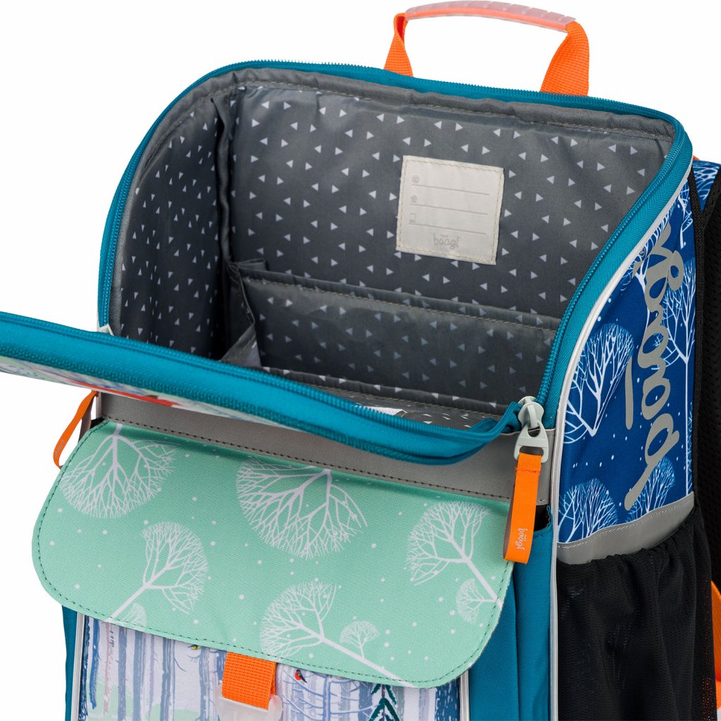 - vo vnútri aktovky sa nachádza priehľadné vrecko s rozvrhom a vnútorný organizér umožňujúci rovnomerné rozloženie hmotnosti, doplnený elastickým pásikom na upevnenie