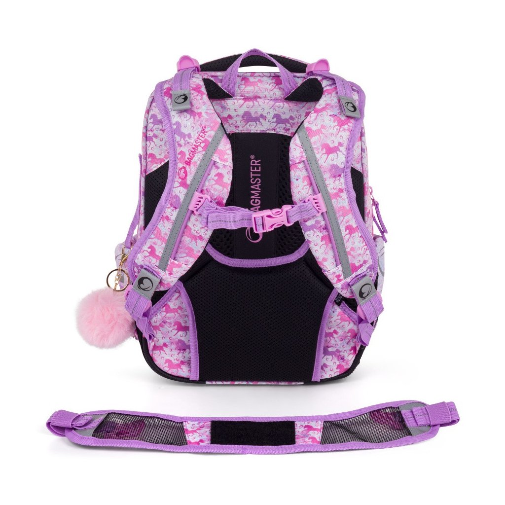 - Ramenné popruhy a chrbtový systém sú mäkko polstrované. Popruhy sú nastaviteľné pomocou hornej a dolnej plastovej pracky. Dĺžku je potrebné upraviť, keď školáčka rastie. Celková dĺžka je 36 cm. Konce popruhov sú magnetické, takže neprekážajú jednoducho ich pripevnite pomocou magnetu na plastový klip