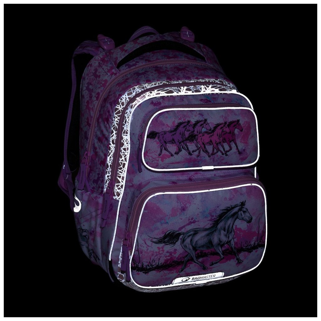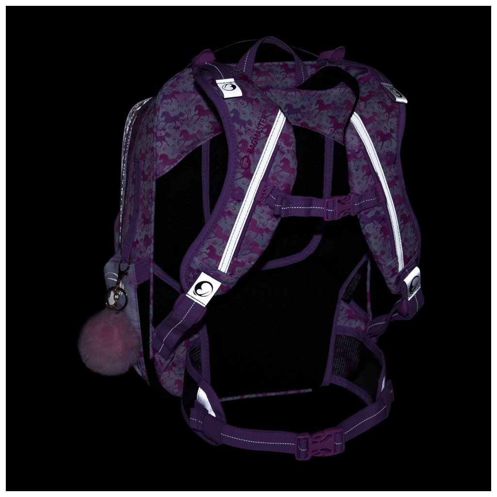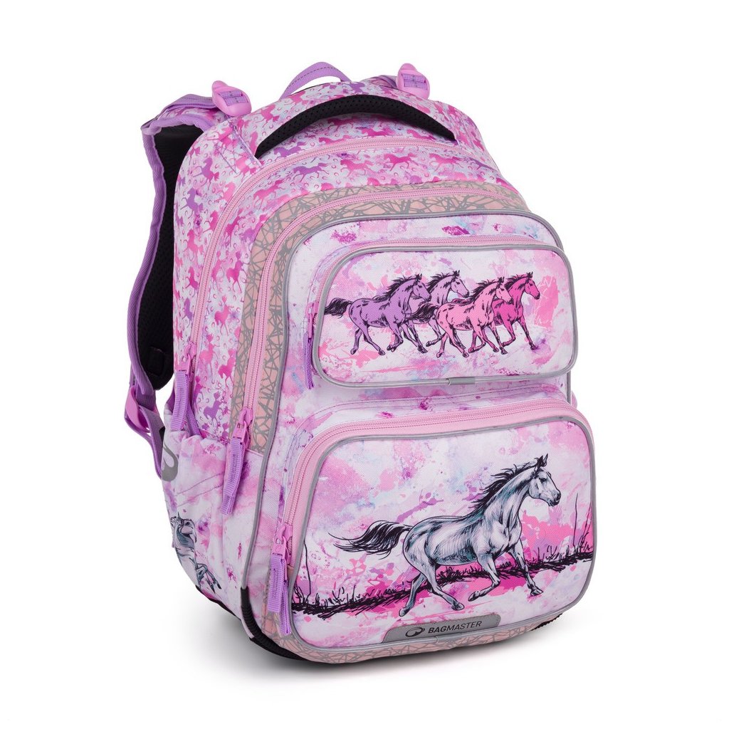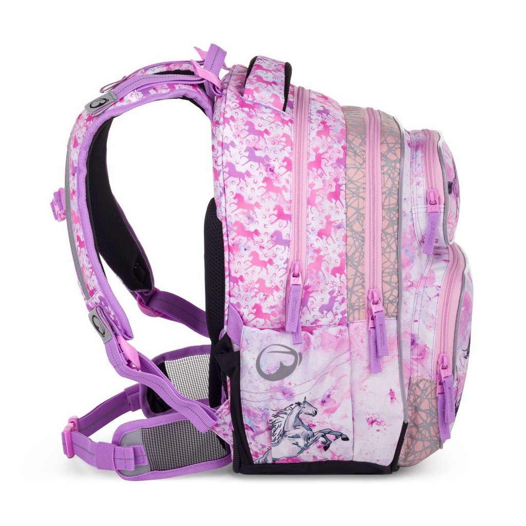Mäkký ružovo-fialový batoh s koníkmi pre dievčatká od 1. do 3. triedy. Je mimoriadne ľahký, a pritom priestranný. Má dve veľké priehradky a dve praktické predné vrecká. Stojí na plastových nožičkách a v tme svieti pomocou reflexných prvkov. Nový chrbtový systém s nastaviteľným hrudným pásom a ľahkým odnímateľným bedrovým pásom je navrhnutý s ohľadom na zdravé chrbty detí.
