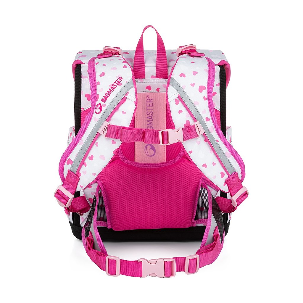 Prima ružovo-sivá aktovka Bagmaster s roztomilou pandou pre všetky malé školáčky na prvom a druhom stupni. Je mimoriadne ľahká, má ergonomicky tvarovaný chrbát a prehľadnú priestrannú hlavnú priehradku. Bočné vrecká obsahujú fľašu na pitie a dáždnik. Aktovku zdobí dievčenský motív, chlpatá visačka a reflexné prvky.