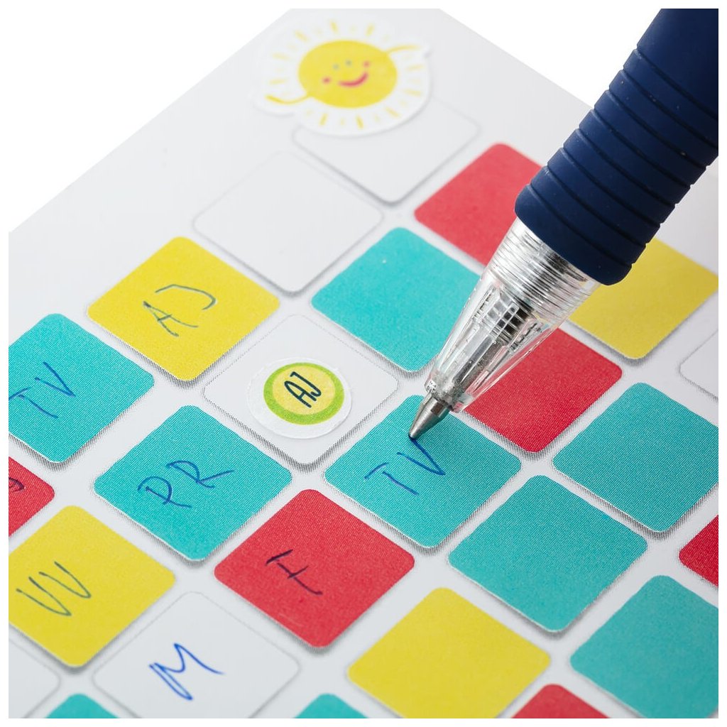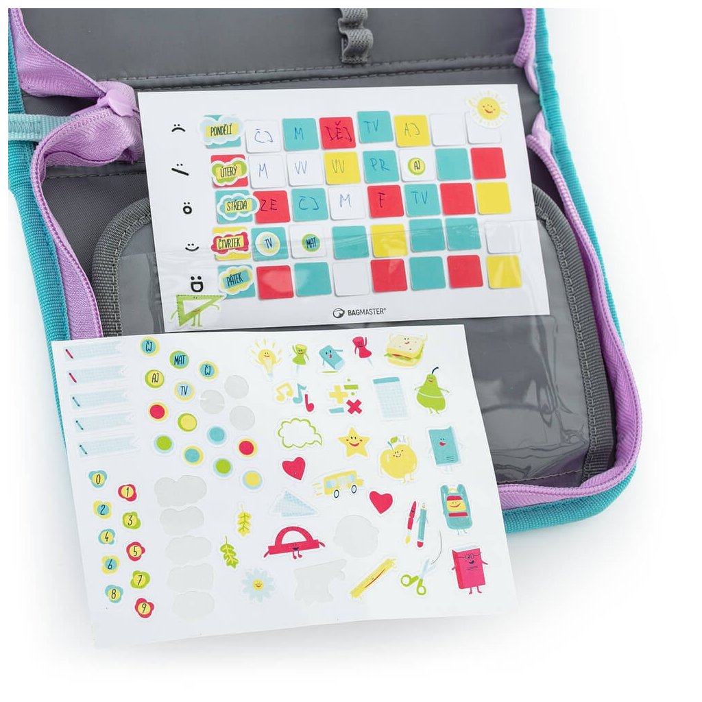 - balíme kufor tabuľku na rozvrh hodín a sadu nálepiek ktoré môžu deti použiť na kreatívnu výzdobu celého školského týždňa. Môžu si napríklad označiť hodinu matematiky symbolom pravítka;