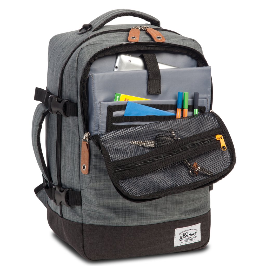 Batoh je vybavený veľkým hlavným vreckom s dvojcestným zipsom pre ľahký prístup k vašim veciam. Predné vrecko obsahuje organizér, takže bude ideálnym spoločníkom na služobných cestách alebo pri štúdiu. Vďaka textilným horným a bočným držadlám sa batoh dá ľahko prenášať v ruke. Batoh je navrhnutý s ohľadom na bezpečnosť a organizáciu vašich vecí. Jeho konštrukcia umožňuje jednoduché rozopnutie hlavného vrecka po celom obvode, čo uľahčuje balenie. Vďaka popruhu na pripevnenie na kufrový vozík môžete ľahko prenášať viac kusov batožiny naraz.