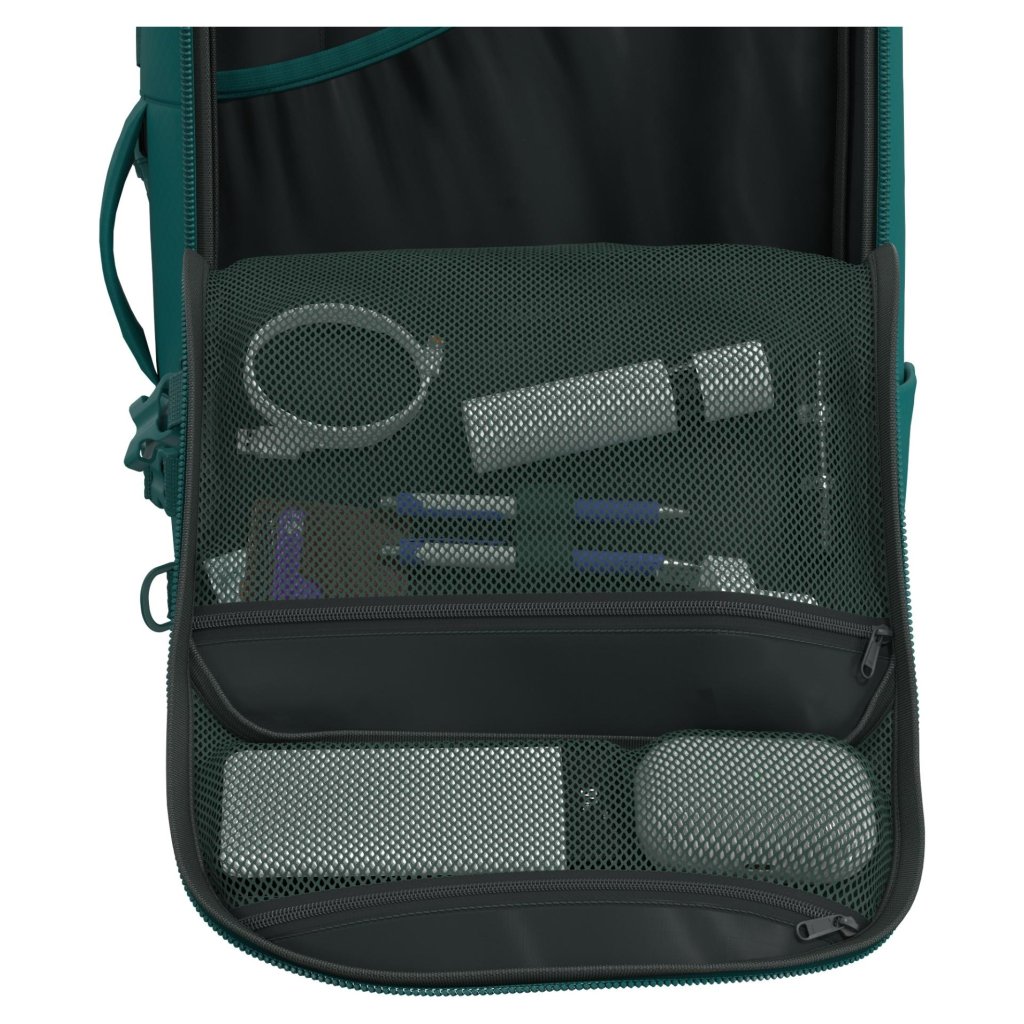 Kompletný chrbtový systém pozostáva z polstrovaný bedrový pás, hrudný popruh a horné stabilizačné popruhyna rozloženie záťaže a zvýšenie pohodlia pri nosení. Praktické puzdro na vozík umožňuje pripevnenie na rukoväť kufra a počas bezpečnostných kontrol oceníte rýchlo prístupné vrecká a dômyselnú organizáciu vo vnútri.
