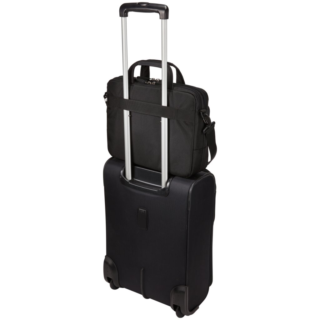 Polstrovaný organizér poskytuje řadu kapes pro kabely, drobnou elektroniku, vizitky i klíče. Komfort při nošení zajišťují sklopná polstrovaná ucha, která příjemně padnou do ruky, a nastavitelný odnímatelný ramenní popruh s výstelkou. Tichá PU táhla zipů eliminují nežádoucí hluk při pohybu. Praktický průchozí popruh umožňuje uchycení brašny k teleskopickému madlu cestovního kufru.