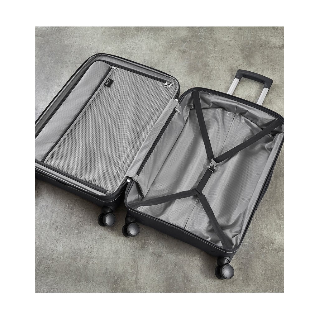 Kufrík je uzatvárateľný na zips, oba jazdce zipsu sa dajú zasunúť do TSA zapusteného kombinačného zámku. Vnútorný objem kufra možno zväčšiť pomocou druhého zipsu. Horné a bočné rukoväte sú plastové. Na zadnej strane puzdra je štítok s adresou. Má ľahký výsuvný systém, priehradku s vekom oddelenú látkovou prepážkou, vnútorné vrecká a upevňovacie popruhy.