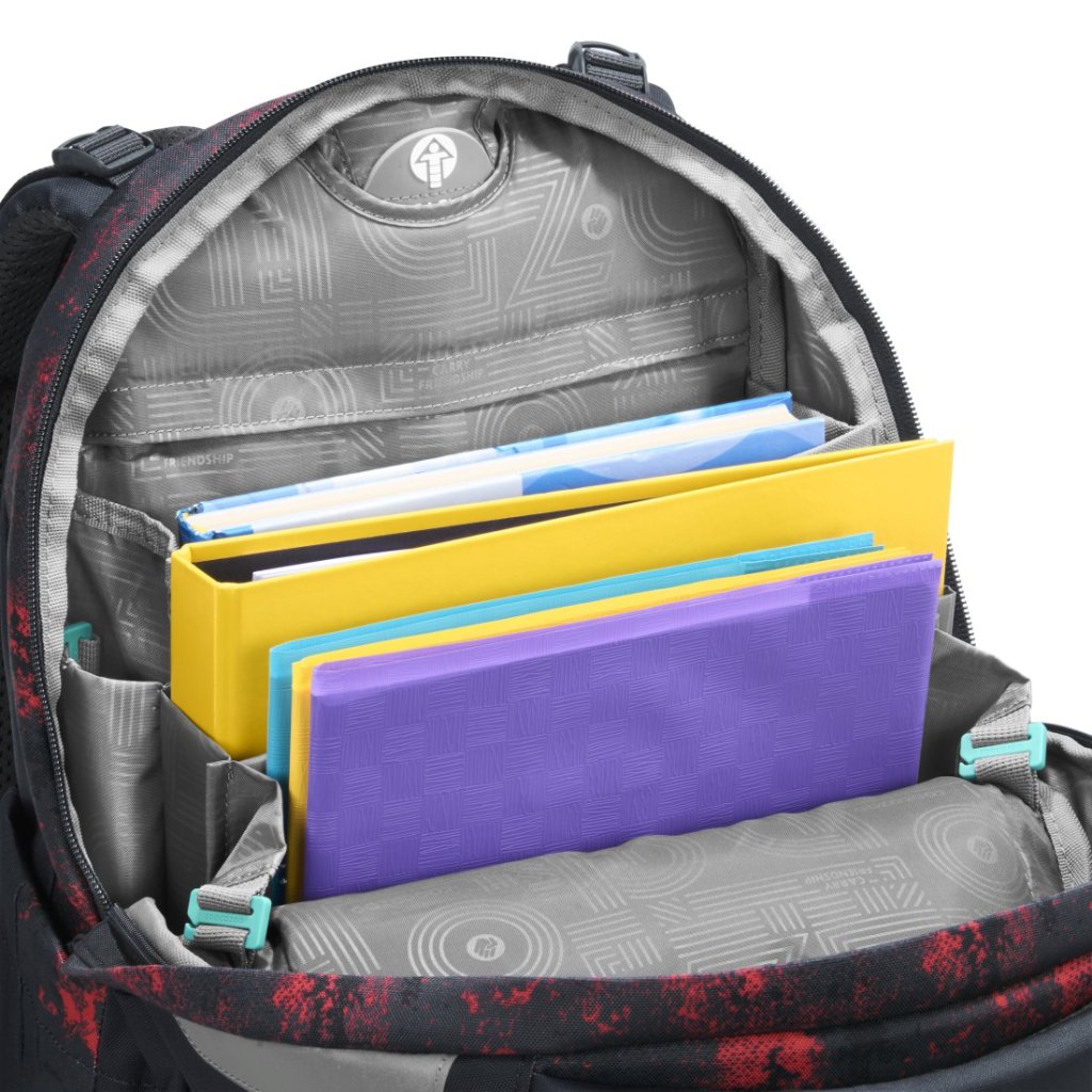 Vnútorné usporiadanie batohu ponúka dostatok priestoru na učebnice, zošity a každodennú výbavu. Hlavná priehradka s integrovanou časťou na knihy je umiestnená blízko chrbta, čo pomáha lepšiemu rozloženiu hmotnosti.