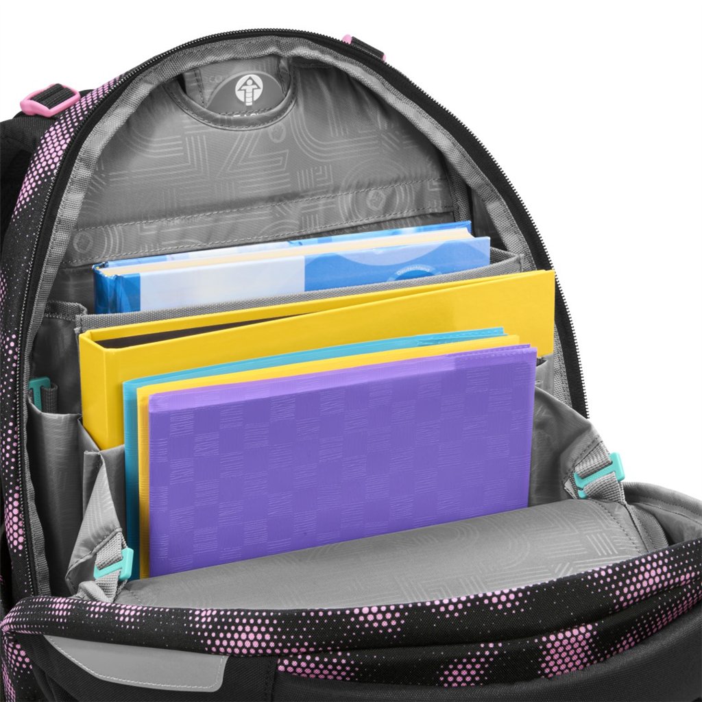 Vnútorné usporiadanie batohu ponúka dostatok priestoru na učebnice, zošity a každodennú výbavu. Hlavné priehradky s integrovanou časťou na knihy sú umiestnené blízko chrbta, čo pomáha lepšiemu rozloženiu hmotnosti.