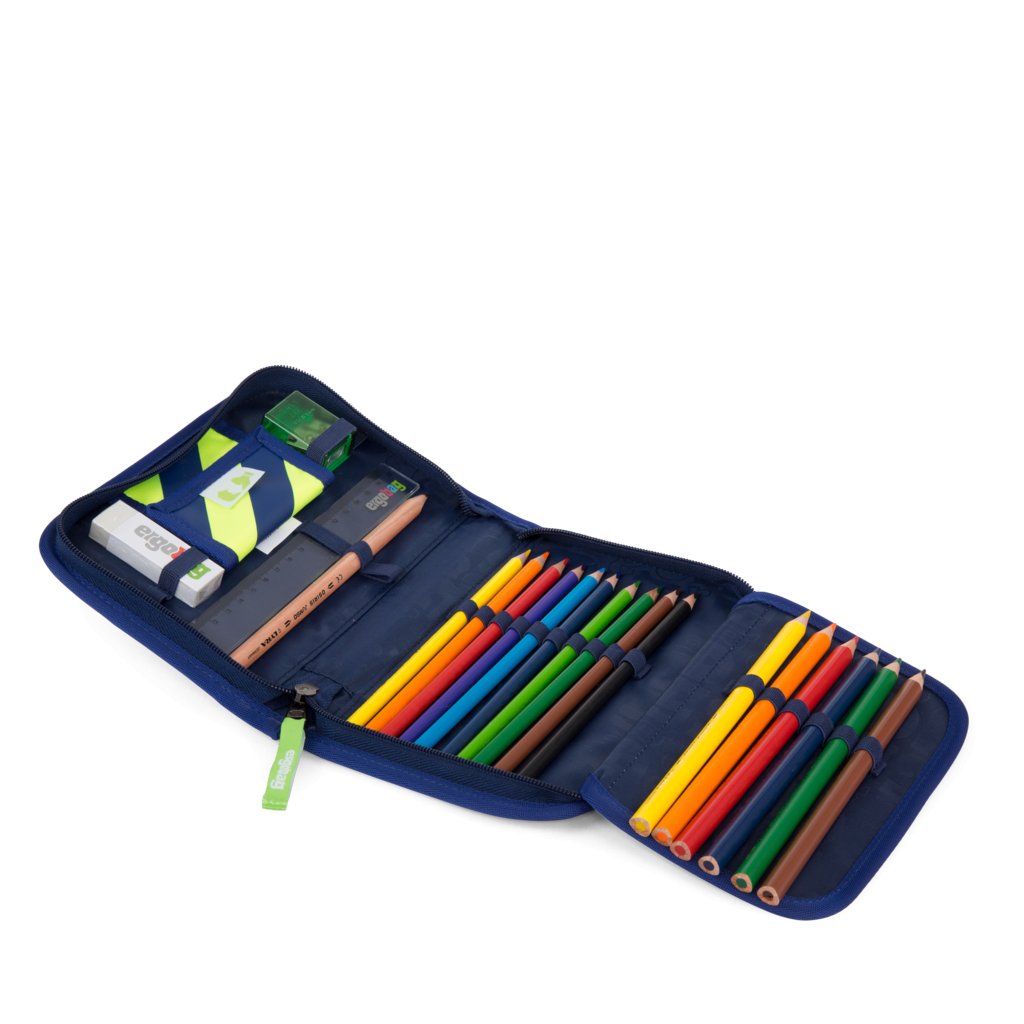 Plne vybavený jednoposchodový veľký peračník Ergobag s chlopňou, ktorý obsahuje trojhranné pastelky Lyra, ceruzku, orezávač, gumu a pravítko. Pastelky a ceruzka sú trojuholníkové, čo uľahčuje ich držanie a podporuje správny úchop. Výroba peračníka je šetrná k životnému prostrediu. Peračník je vyrobený zo 100 % recyklovaných PET fliaš.