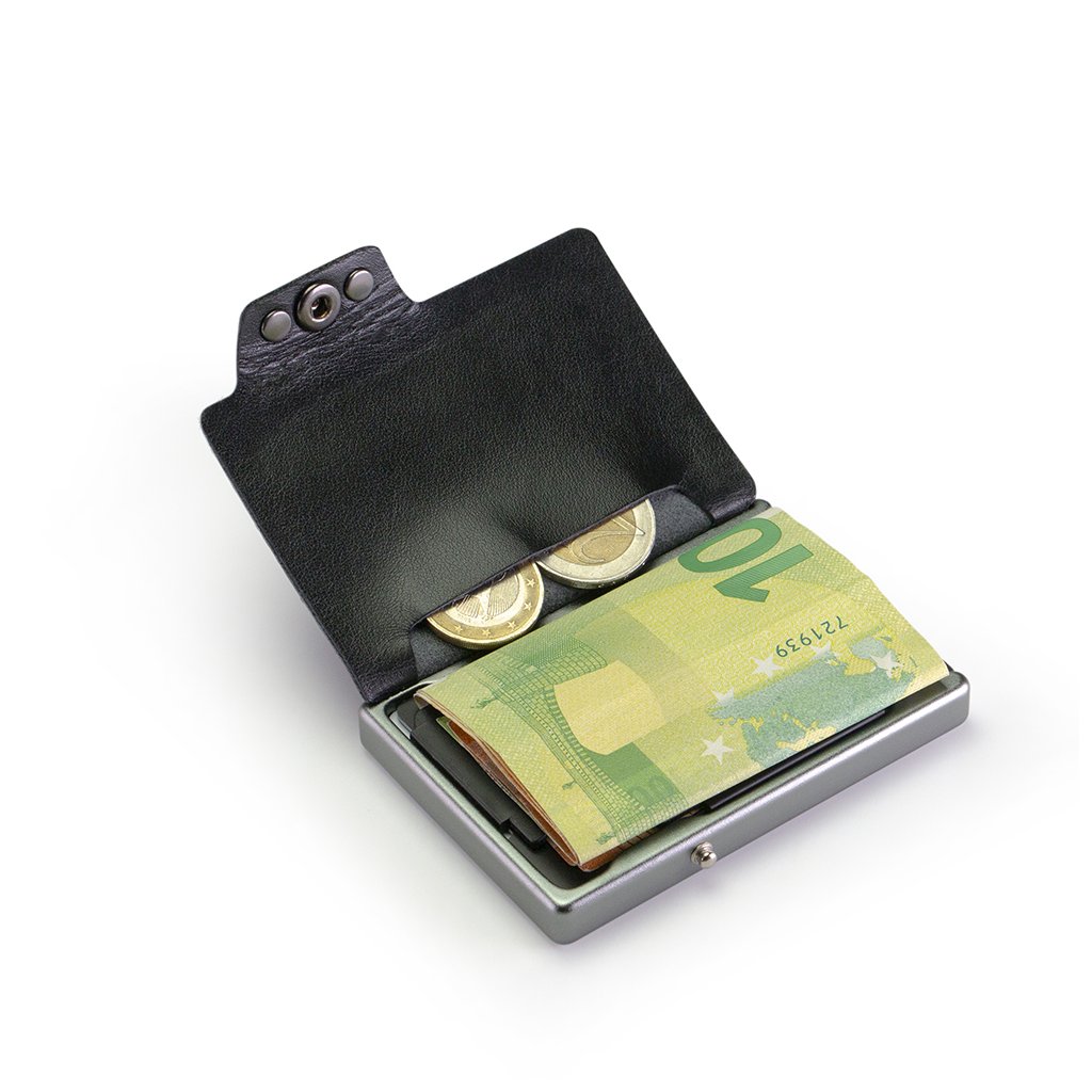 Do puzdra sa zmestí až deväť kariet, bankovky sú pripevnené patentovaným klipom s úplnou 360° ochranou RFID a mince sú uložené v samostatnom vrecku. Nemagnetický dizajn ľahko prejde bezpečnostnými kontrolami a zaoblené rohy zabezpečujú pohodlné vyberanie z vrecka