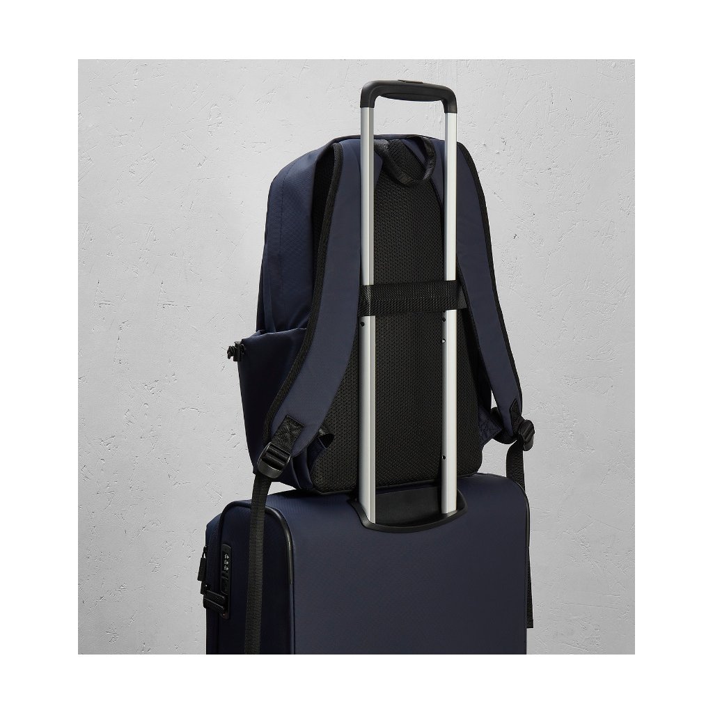 Odolný polyester TPU vyniká mechanickou pevnosťou, odolnosťou proti oderu a chemickému opotrebovaniu a zároveň ponúka vyššiu odolnosť proti prerezaniu a roztrhnutiu ako bežný polyester. Nastaviteľné polstrované ramenné popruhy a polstrovaný chrbát zabezpečujú pohodlie pri nosení. Praktický popruh na chrbte umožňuje batoh ľahko pripevniť k výsuvnému držadlu kufra, čo oceníte na letisku a pri pohybe po meste.