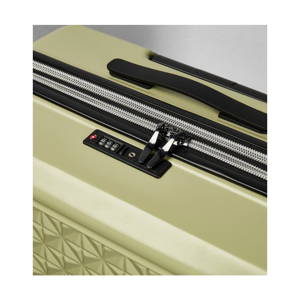 Elegantný povrch s jemnou štruktúrou znižuje viditeľnosť škrabancov, Zámok TSA zabezpečuje bezproblémové cesty do sveta a obojstranný baliaci systém udržuje veci na svojom mieste.