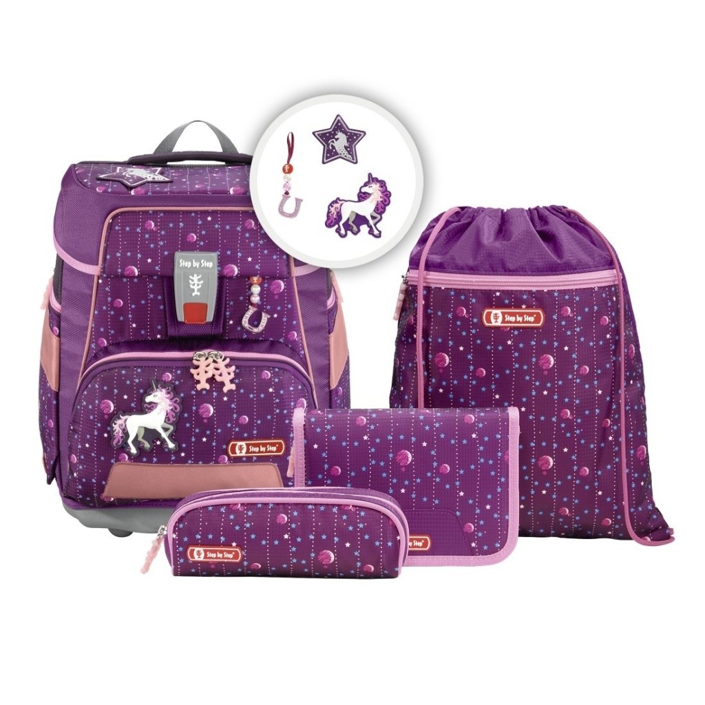 5-dielny set školských potrieb Step by Step Cloud pre prváčikov vo fialovom prevedení s motívom jednorožca, ktorý obsahuje: aktovku, plný peračník, puzdro, vrecúško na cvičebný úbor alebo prezuvky a vymeniteľné 3D obrázky Magic Mags.