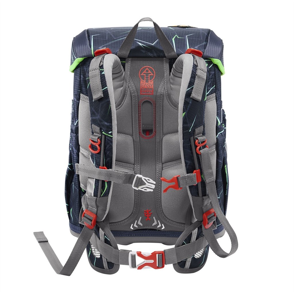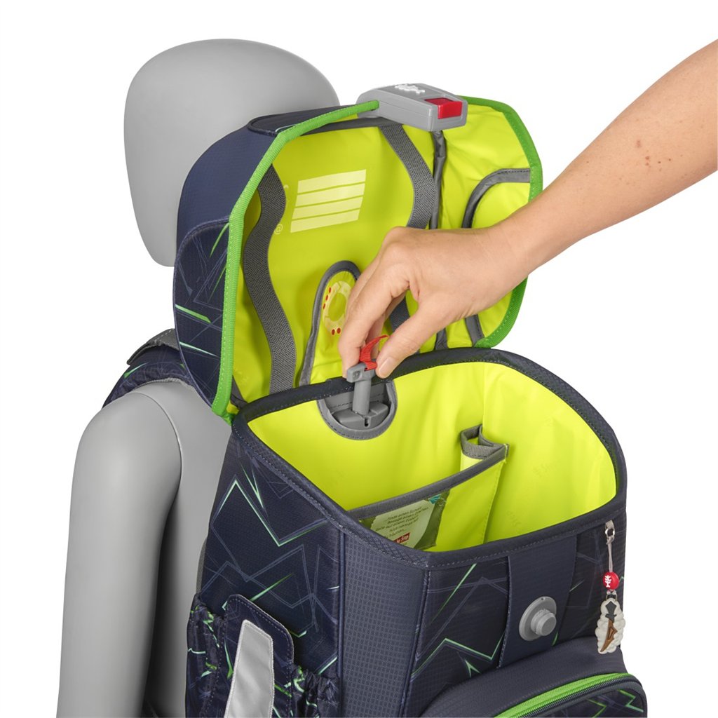 - plynulé nastavenie výšky ramenných popruhov pomocou otočného mechanizmu vo vnútri aktovky zabezpečuje presné nastavenie ramenných popruhov priamo na chrbte dieťaťa