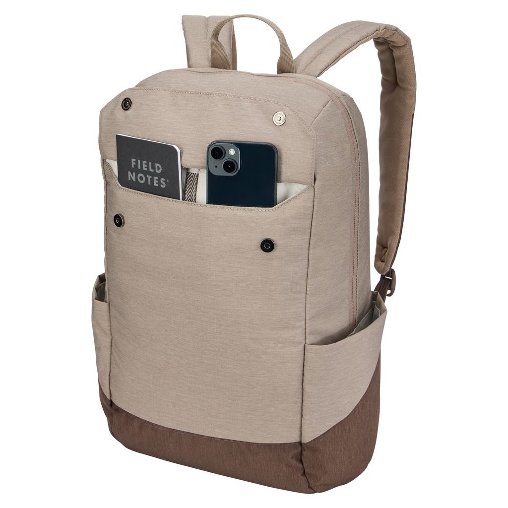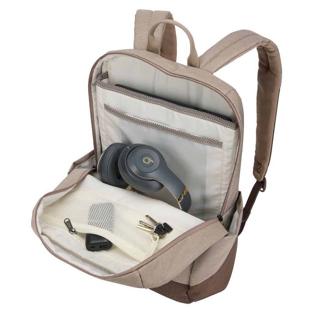 Batoh kombinuje elegantný vzhľad s praktickým usporiadaním vreciek, pohodlným prenášaním a bezpečným úložným priestorom pre elektroniku. Farebná schéma Tinted Taupe/Nuanced Brown podčiarkuje nadčasový charakter radu Lithos.