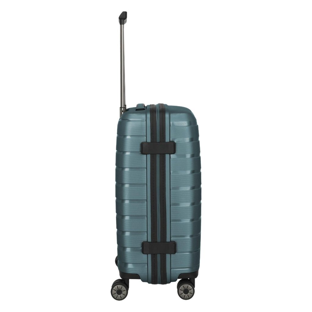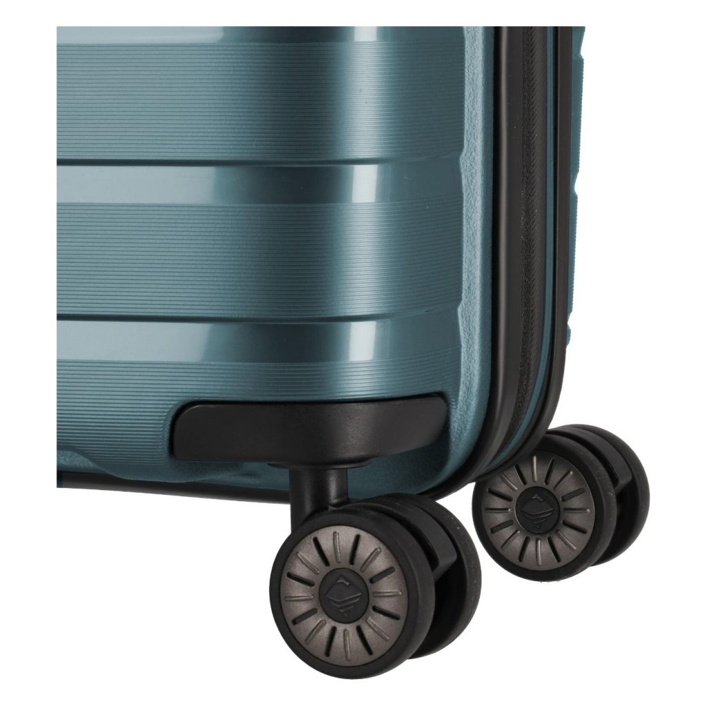 Štyri veľké dvojité kolieska otáčajúce sa o 360° zabezpečujú plynulý, tichý a stabilný pohyb. Povrchová úprava kombinuje lesklé a matné povrchy s reliéfnym lemovaním, ktoré nielen chráni kufor pred poškriabaním, ale zároveň mu dodáva elegantný a prémiový vzhľad.