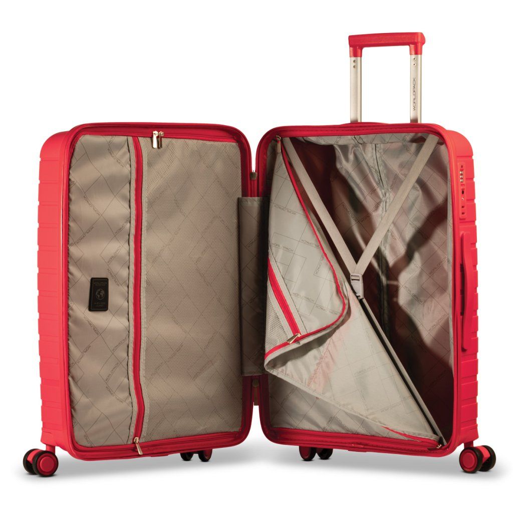 Každý kufor je vybavenýštyri dvojité kolieska s možnosťou otáčania o 360°vďaka ktorým sa batožina pohybuje hladko a ľahko.Teleskopické rukoväte,horné rukoväte a tiež pre stredné a veľké veľkostibočné rukoväte zabezpečiť pohodlnú manipuláciu.Interné vybavenie obsahuje deliacu priehradku na zips so sieťovaným vreckom a fixačné popruhy, takže budete mať svoje veci vždy usporiadané.
